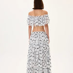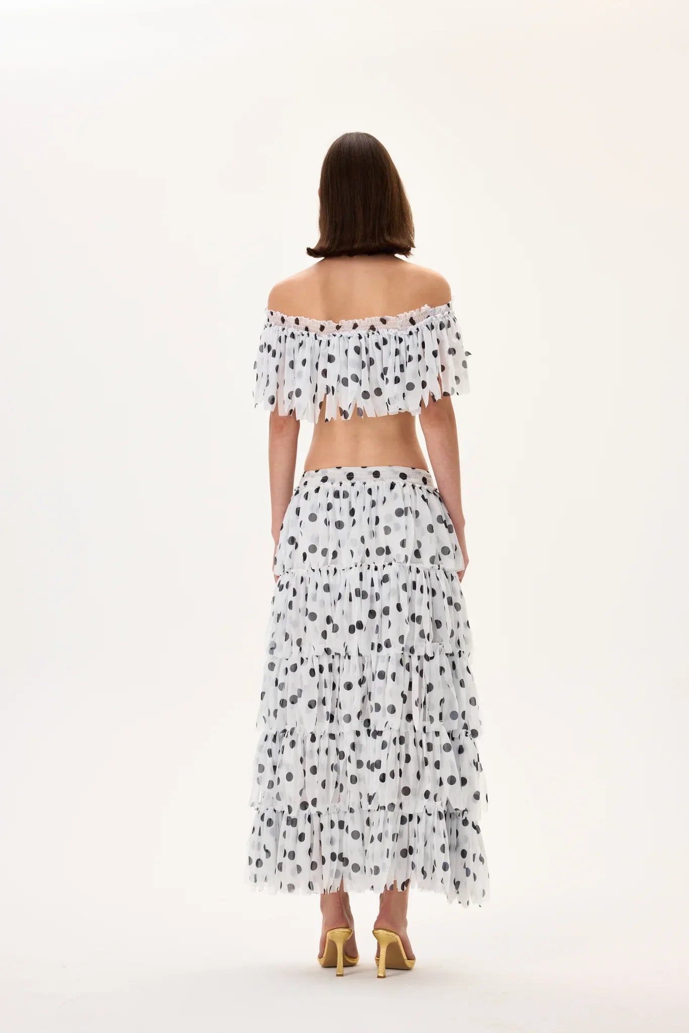 A lightweight chiffon crop top featuring precise laser-cut polka dot detailing for a modern yet playful texture. The elasticated fit enhances comfort while maintaining a stylish cropped silhouette. Crafted from airy chiffon, it offers fluid movement, breathability, and effortless elegance—ideal for summer sets, layering, or casual chic looks.
