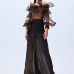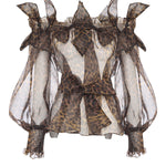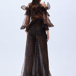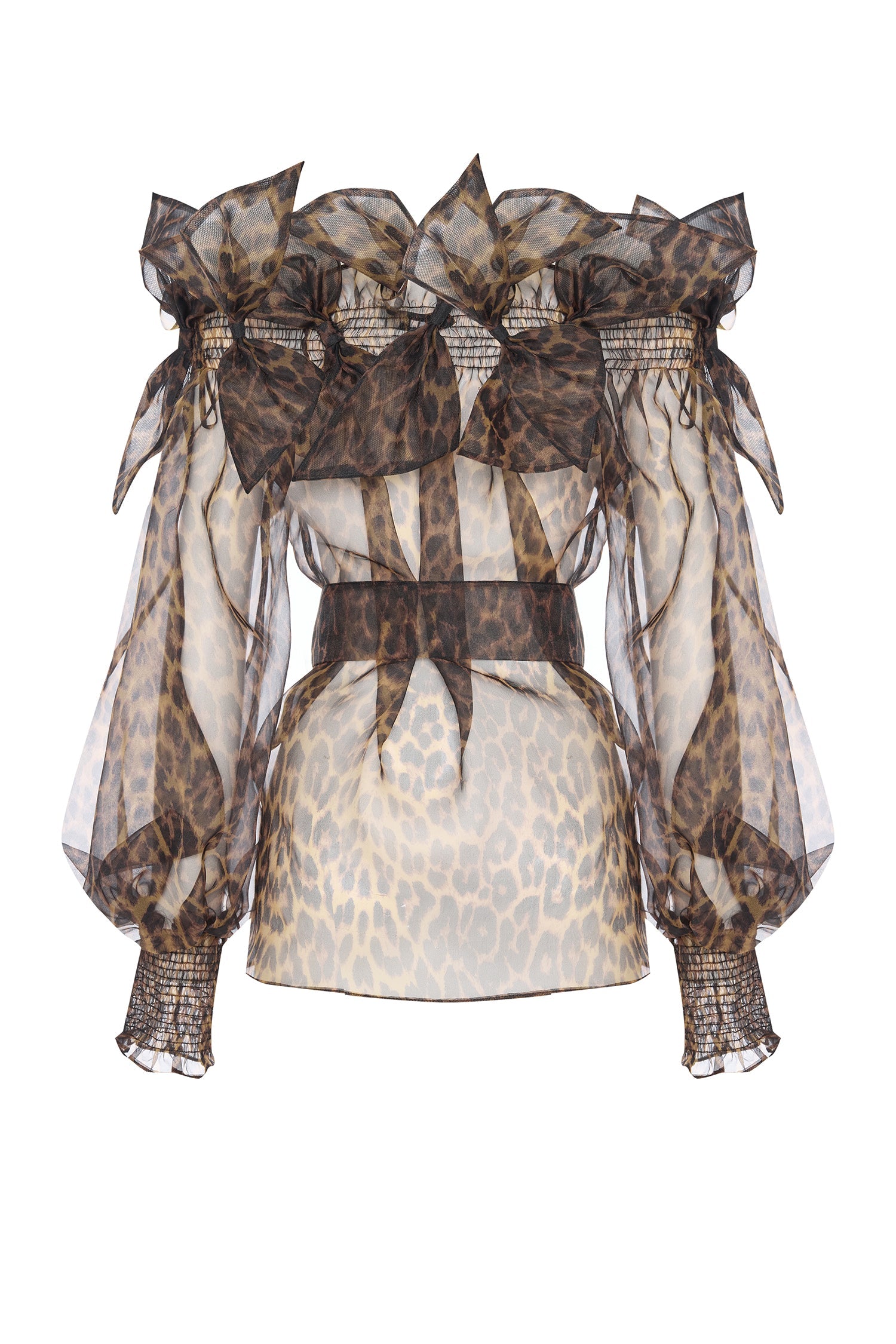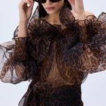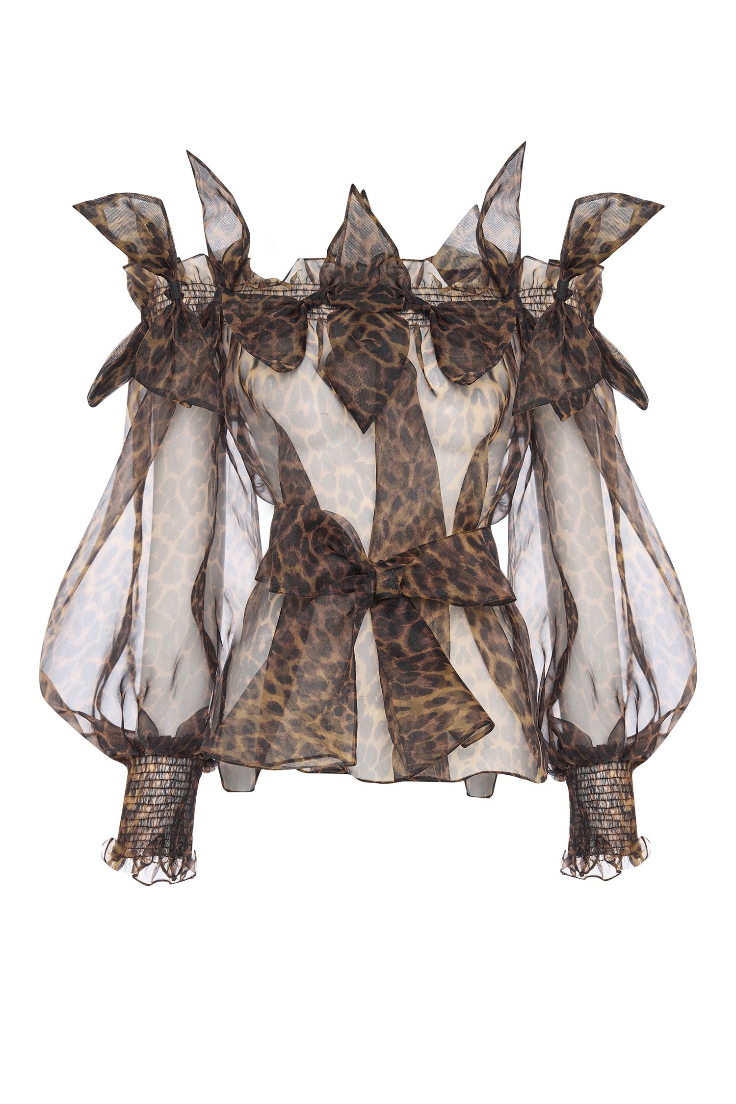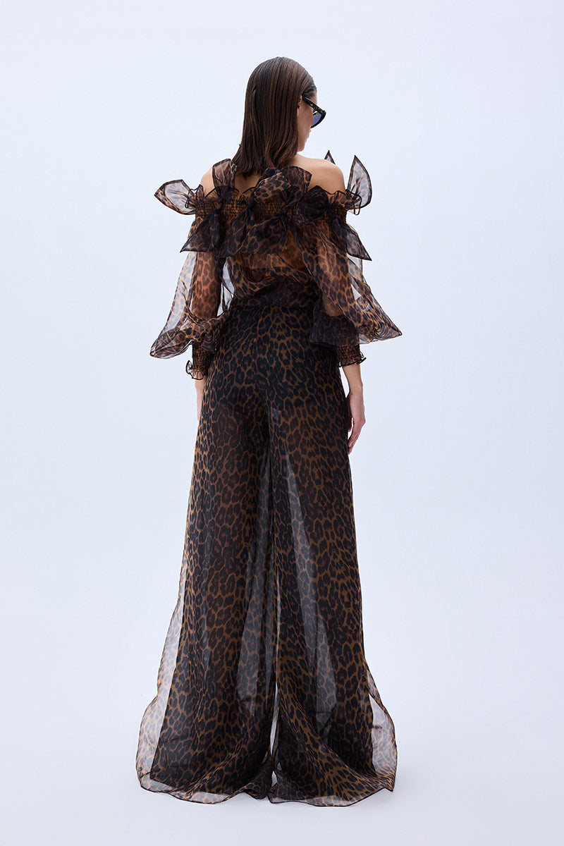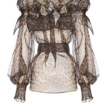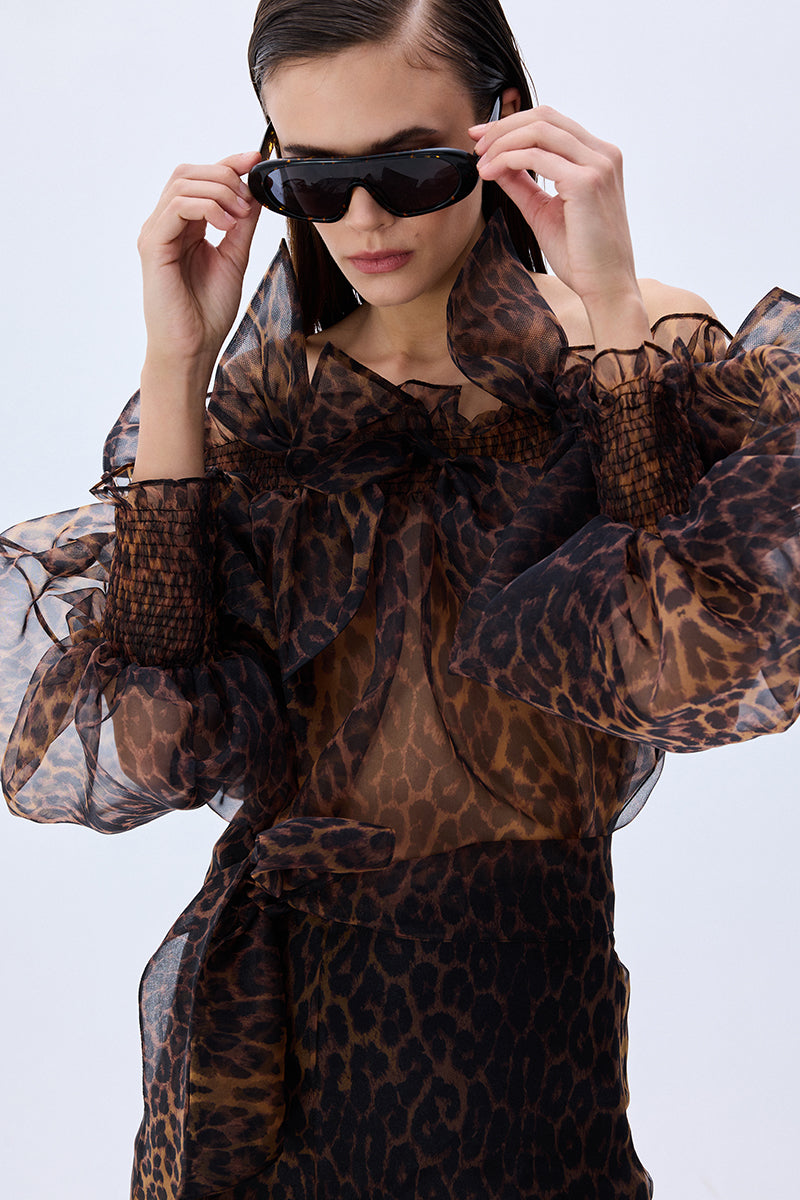 A fierce expression of volume and romance, this leopard print organza shirt features dramatic bows and cascading ruffles. Lightweight yet bold, it adds untamed elegance to both structured and fluid silhouettes.
