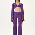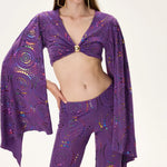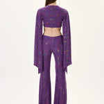 Multicolor Foil-Printed Purple Jersey Crop Top With Flare Sleeves