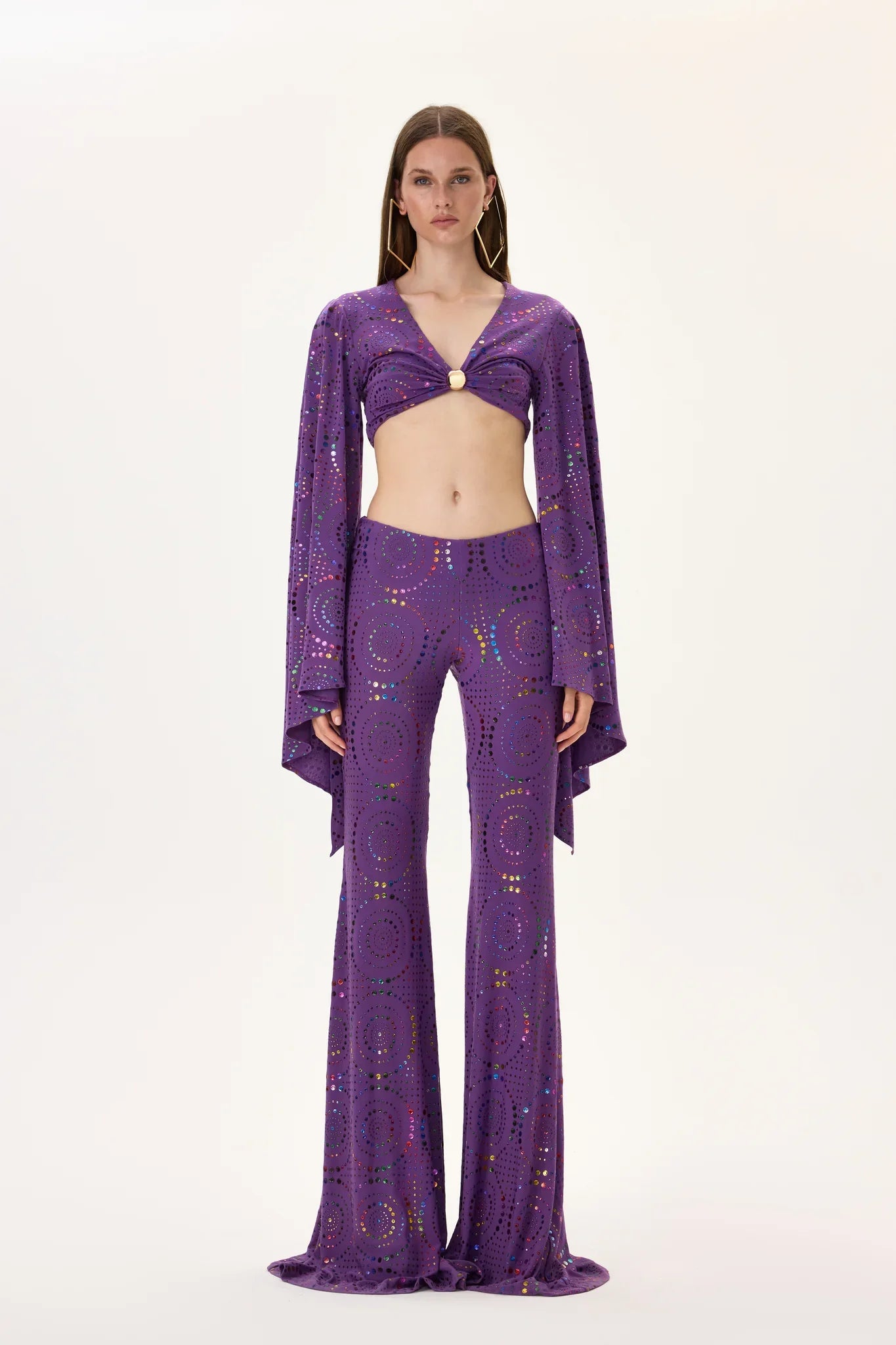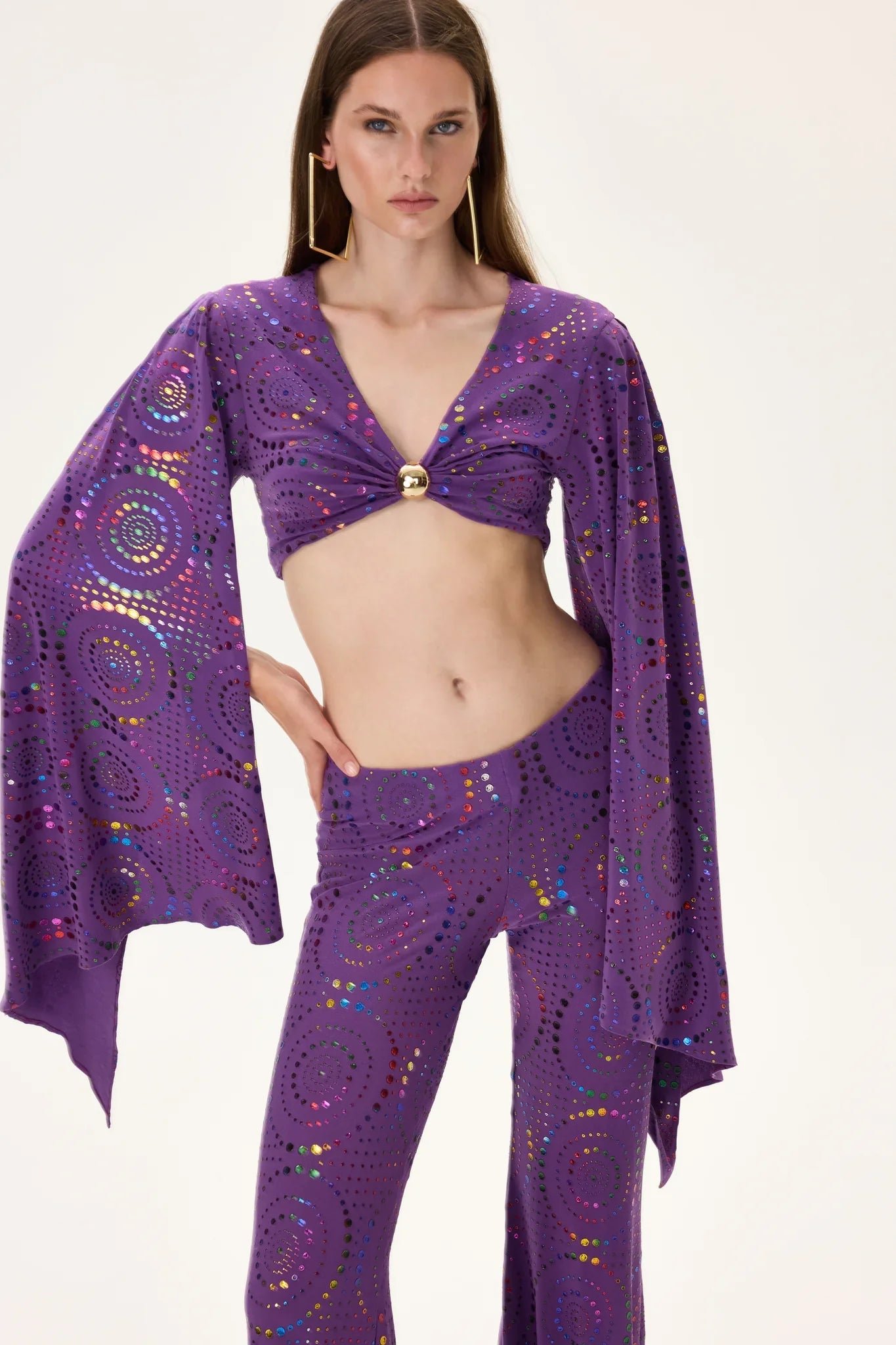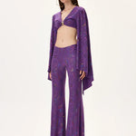 A vivid multicolor foil-printed jersey crop top designed in rich purple tones, accented with reflective foil detailing that brings depth, movement, and sparkle. The dramatic flare sleeves add a fluid silhouette, creating modern elegance and visual impact. Crafted from soft stretch jersey, it offers comfort, flexibility, and a bold statement effect—perfect for contemporary co-ord sets or strong stand-alone styling.