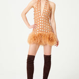 Nude V-Neck Handmade Gold Polka Dot Detailed Silk Chiffon Mini Dress With Organza Flower Details