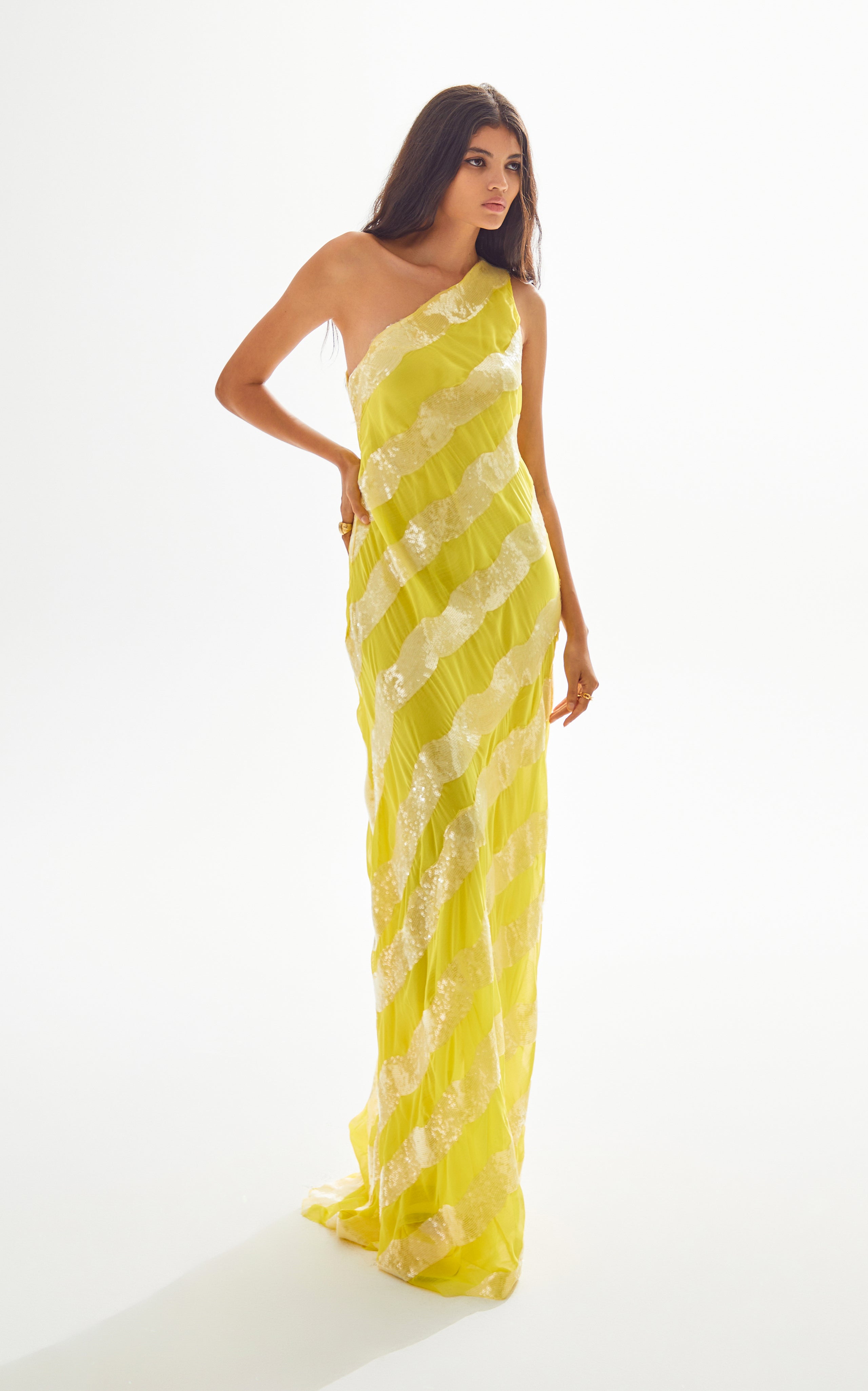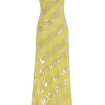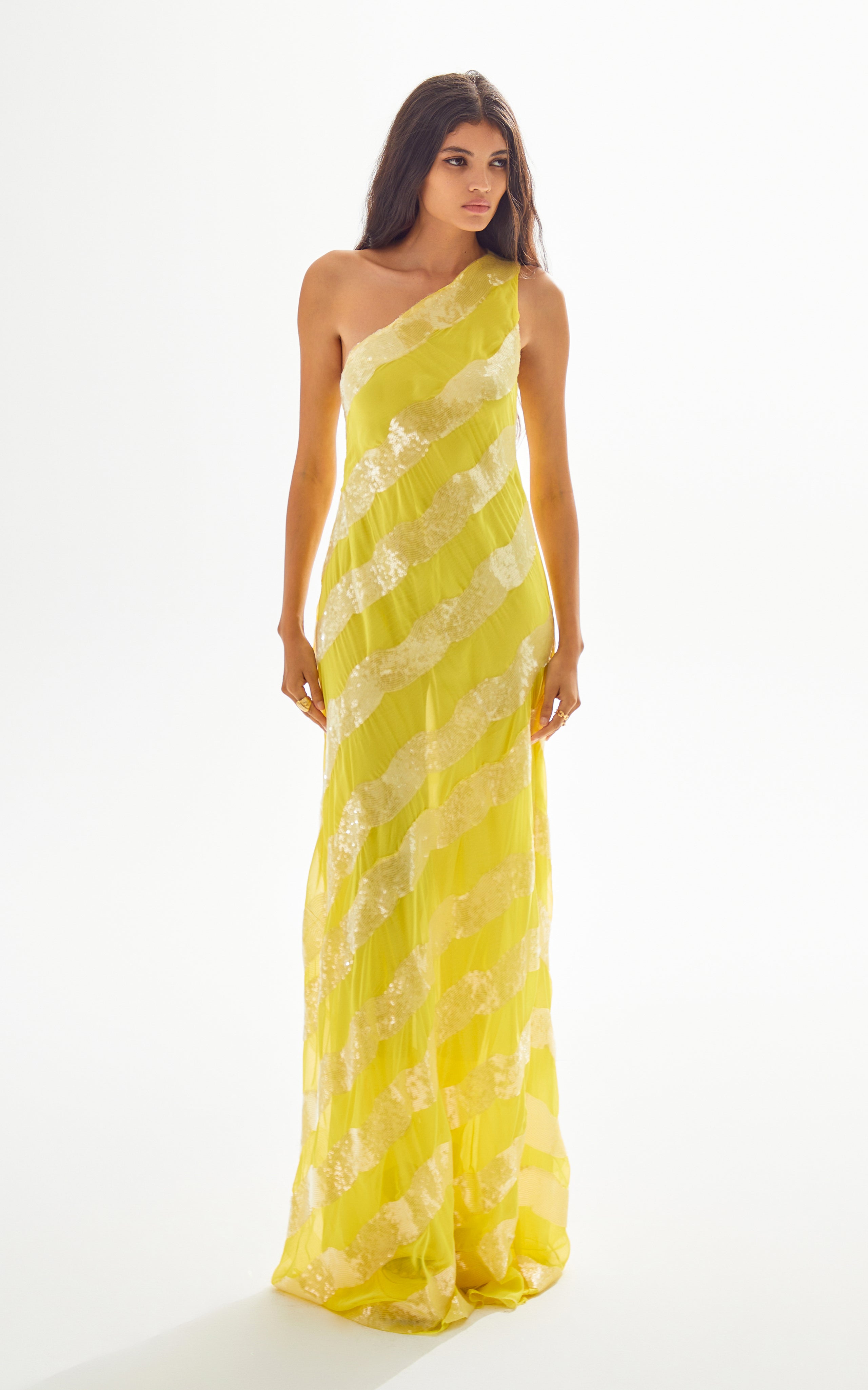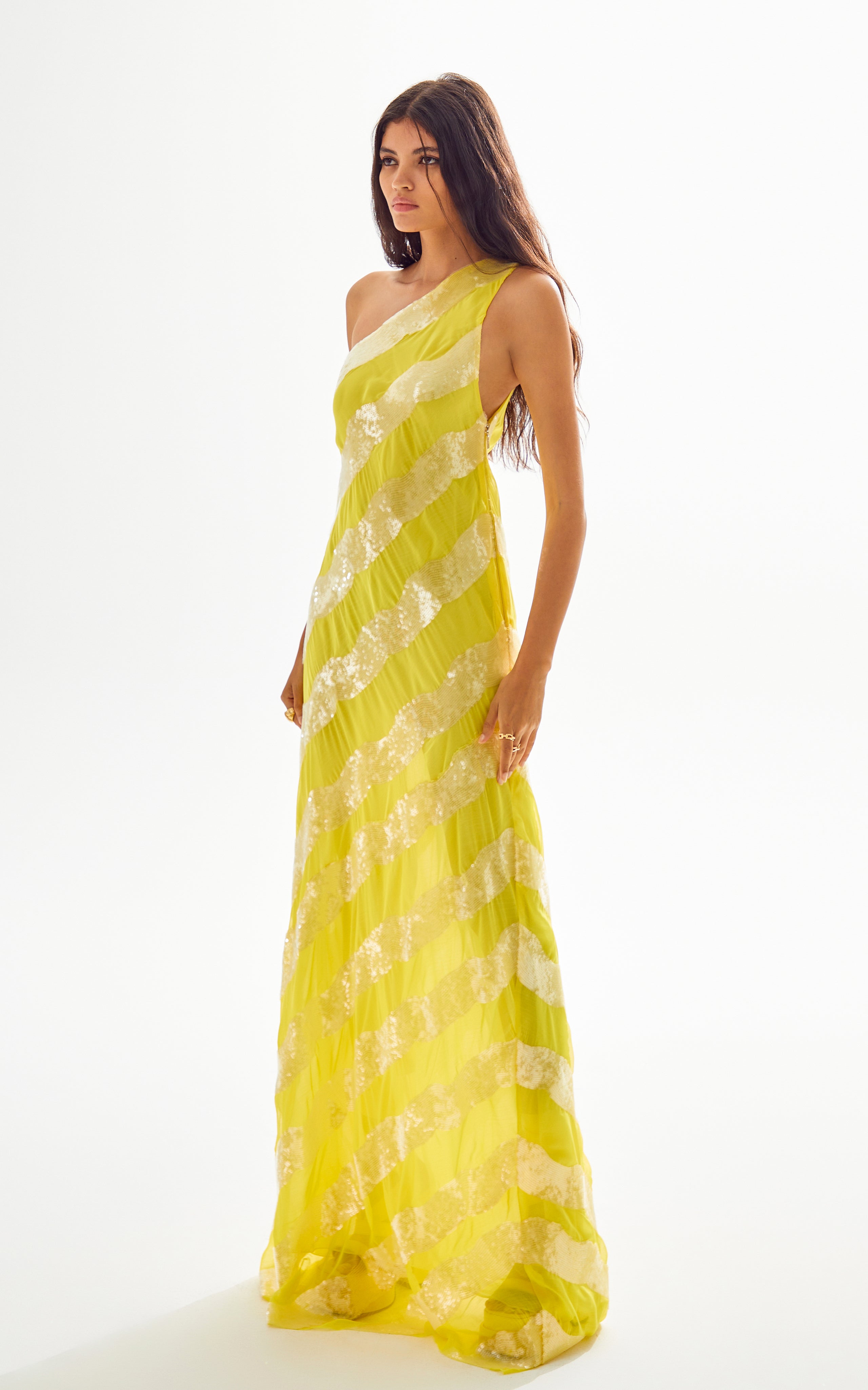 One Shoulder Lemon Maxi Dress with Patterned Sequin Details