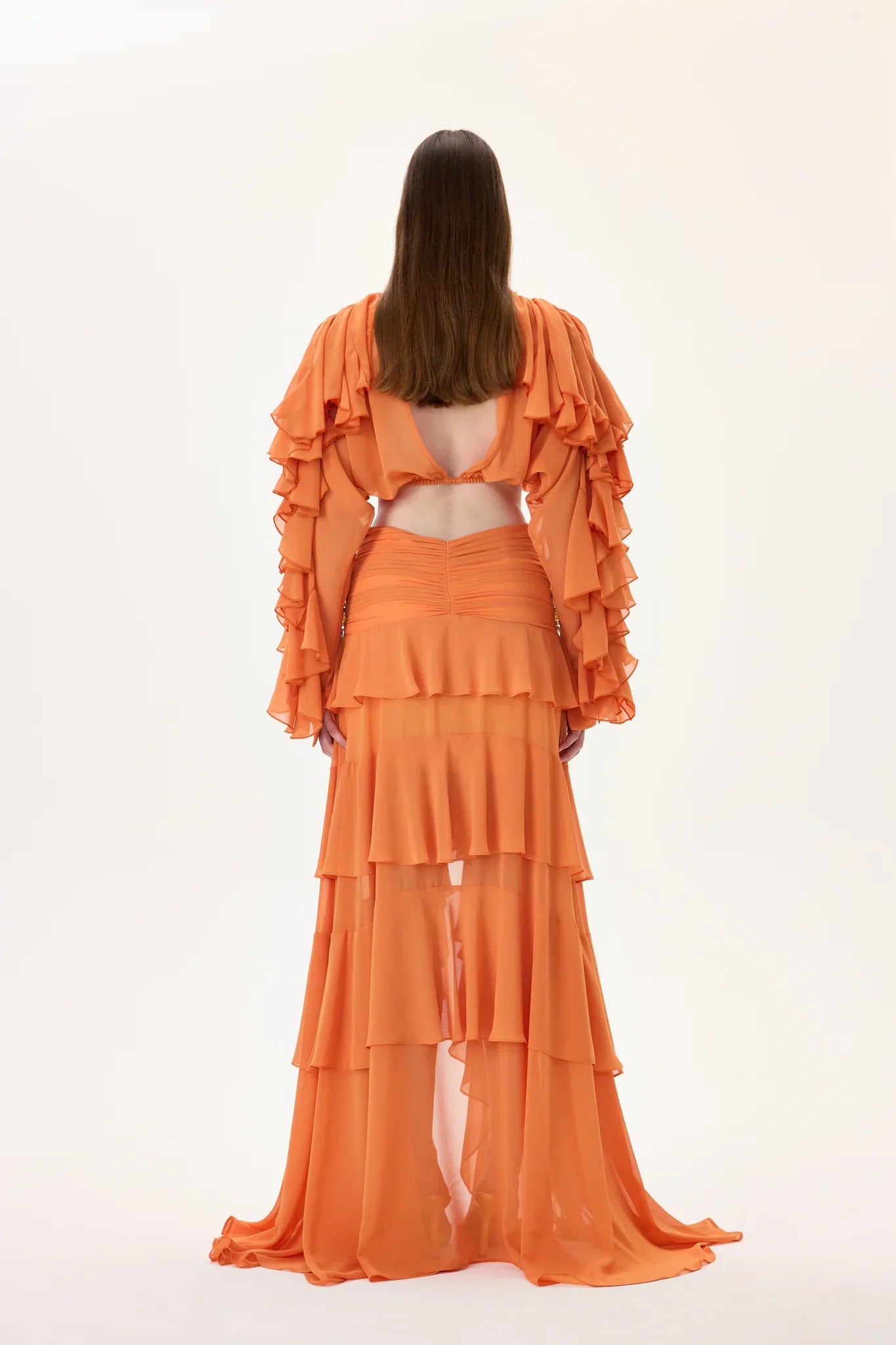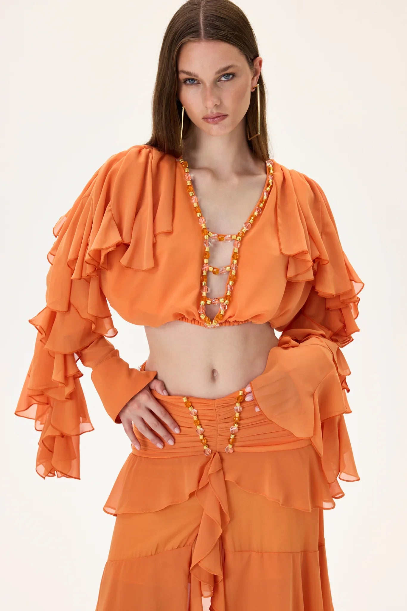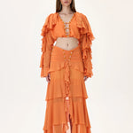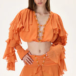 Orange Chiffon Crop Top with Ruffled Sleeves and Stoned Neckline