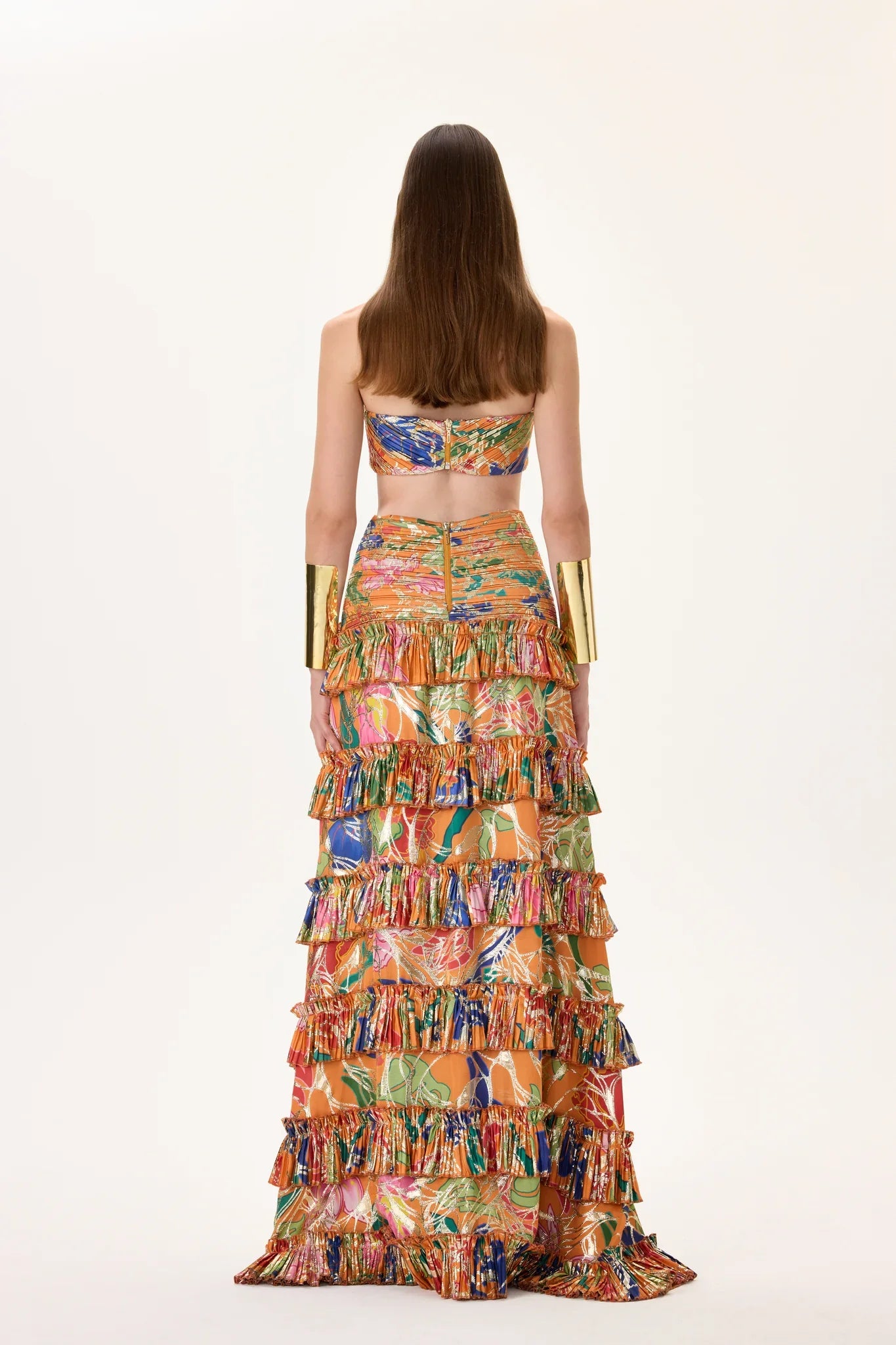 Elegant pleated viscose crop top adorned with multicolor floral patterns and gold foil detailing. Lightweight and luxurious, this piece blends modern sophistication with summer vibrancy.