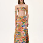 Flowing strapless pleated viscose maxi skirt adorned with multicolor floral prints and highlighted by gold foil accents. Combines elegance and movement for an effortlessly sophisticated summer look.