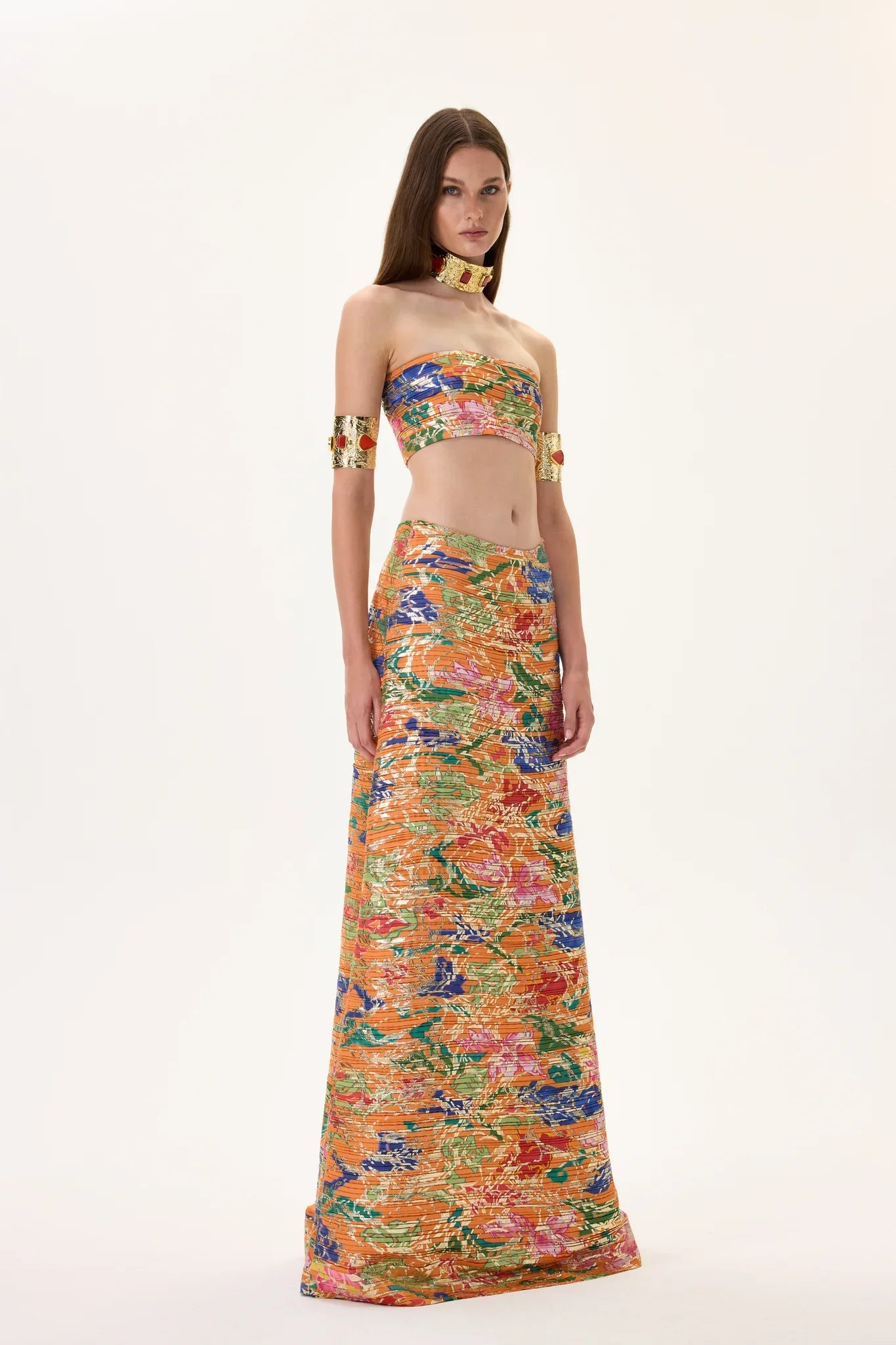 Orange Pleated Viscone Multi Color Flower Printed Strapless Maxi Skirt With Gold Foil Accents