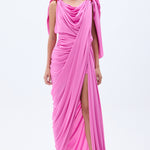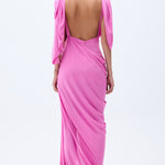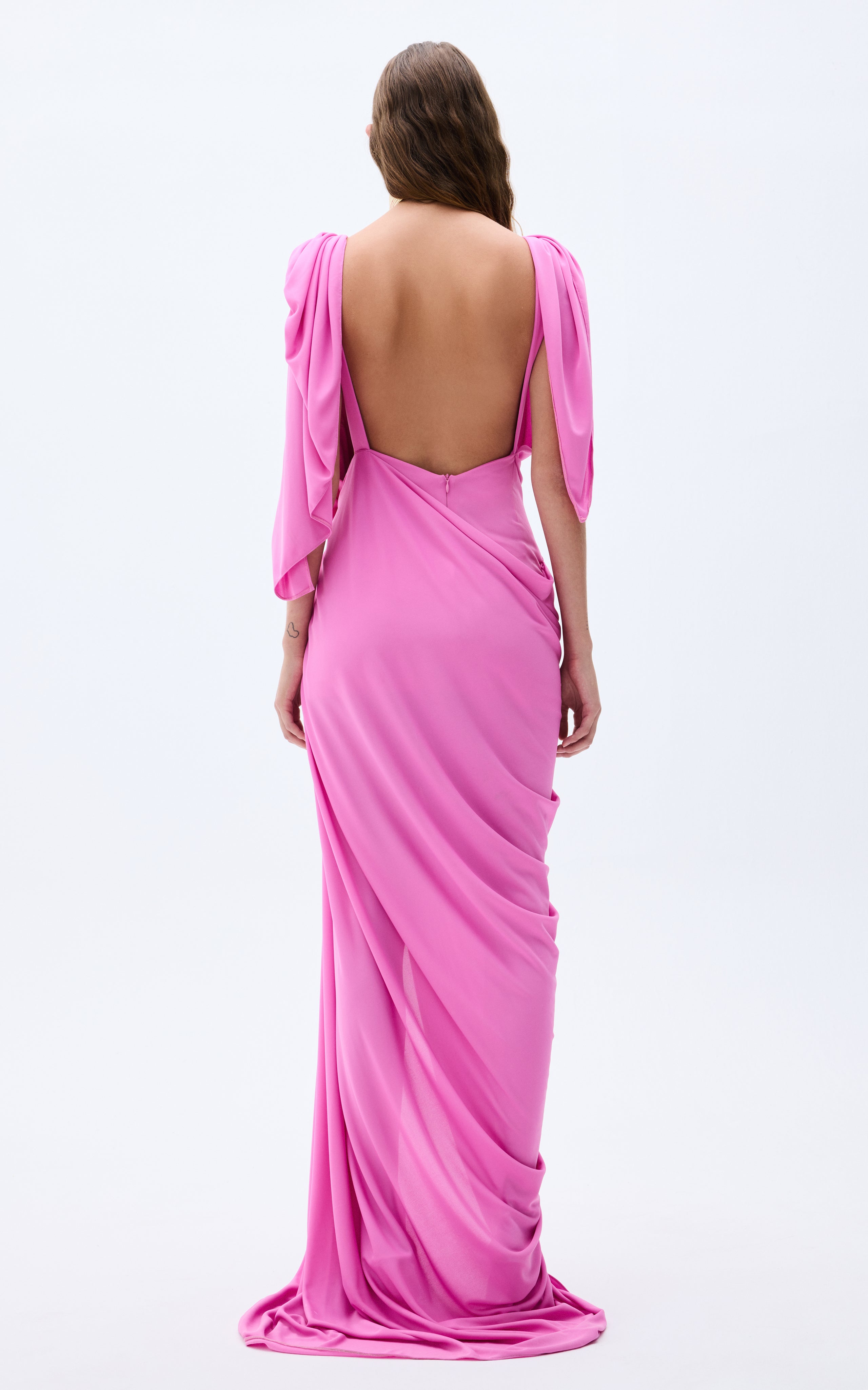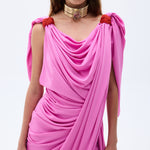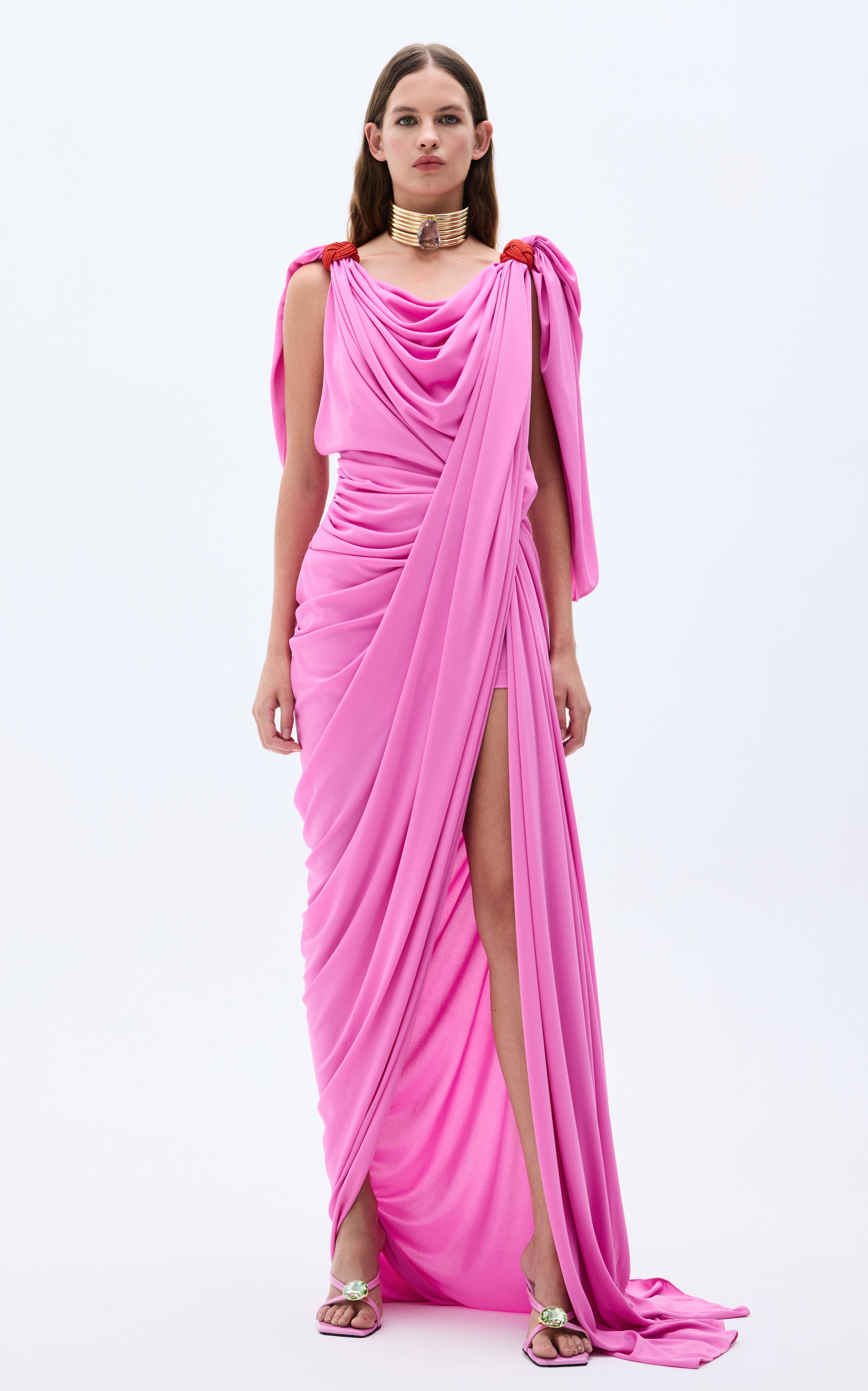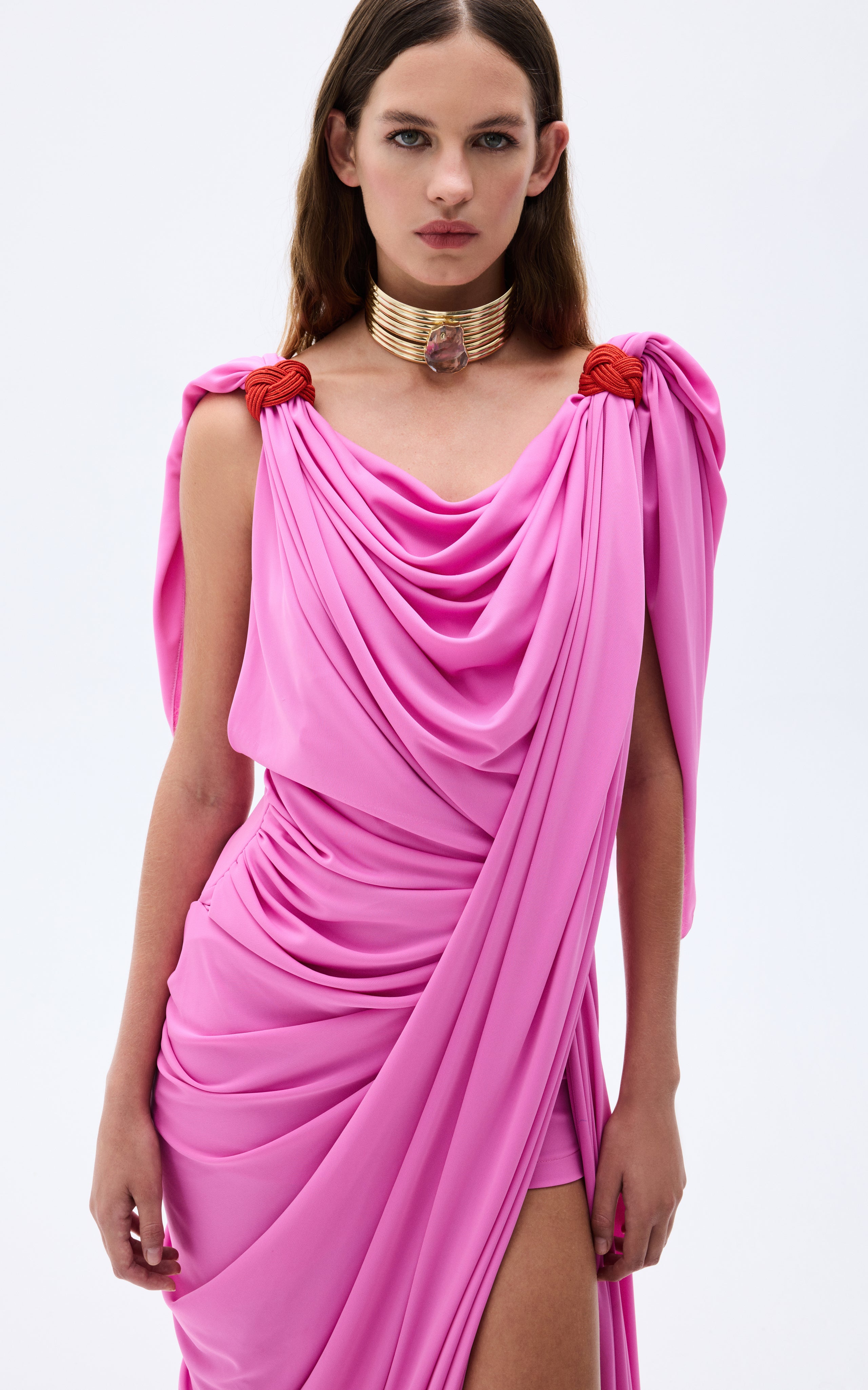 This pink maxi dress is the perfect balance of elegance and edge. The high slit adds a touch of allure, while the red rope detail on the shoulders creates a striking contrast. Flowing and flattering, it’s a bold yet sophisticated choice.