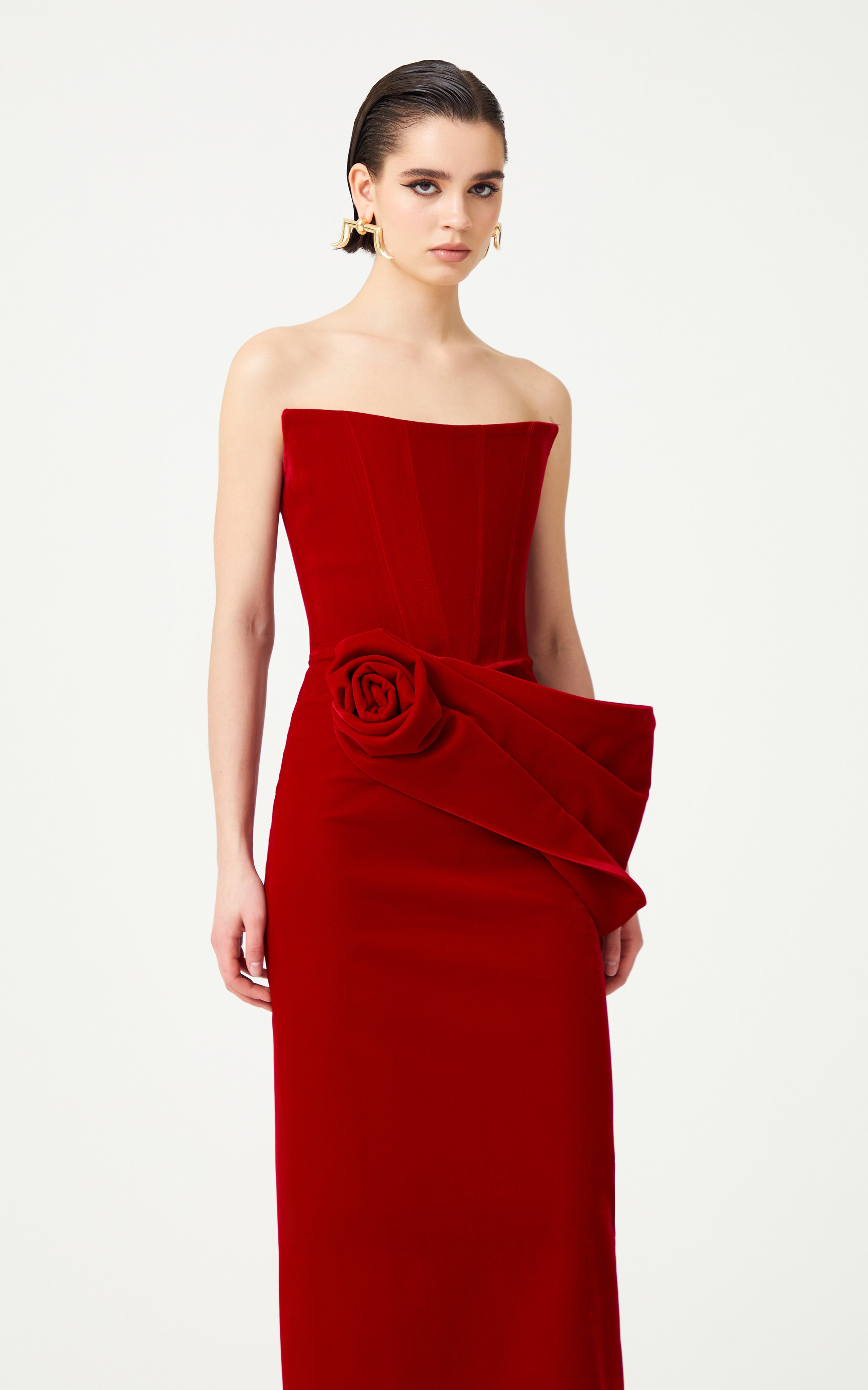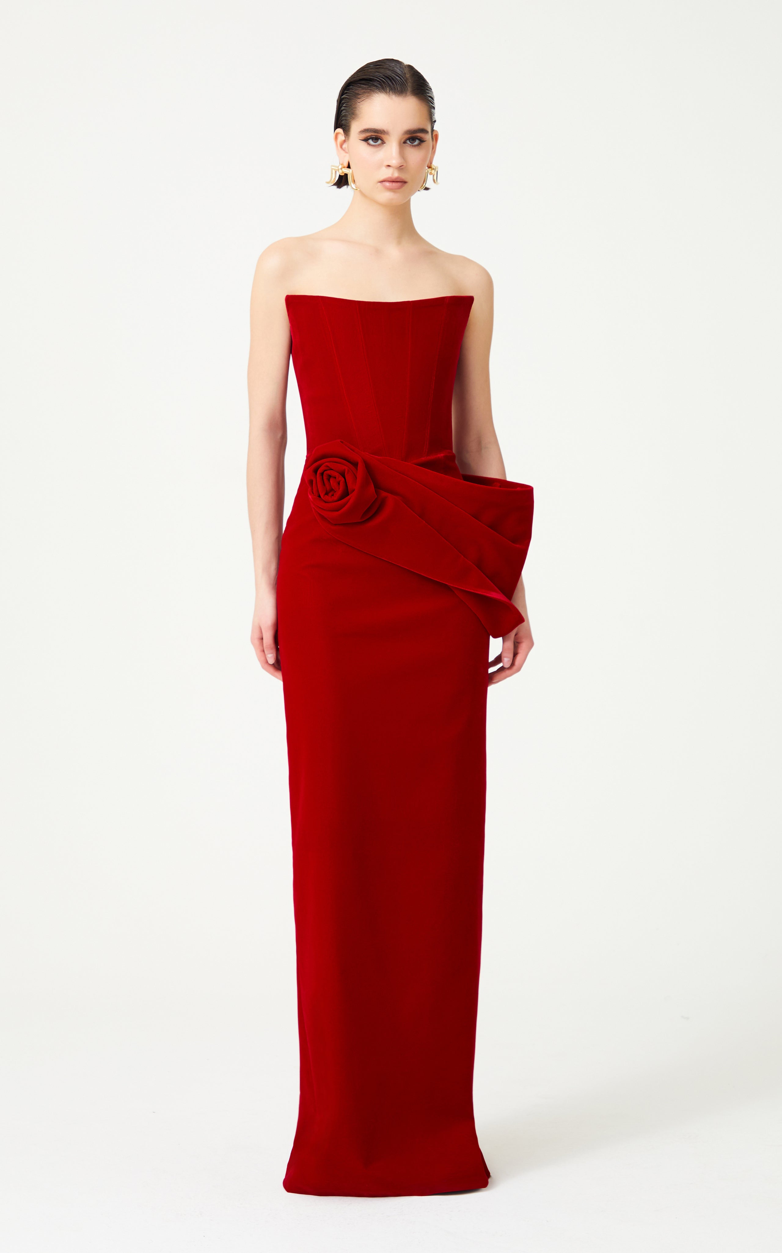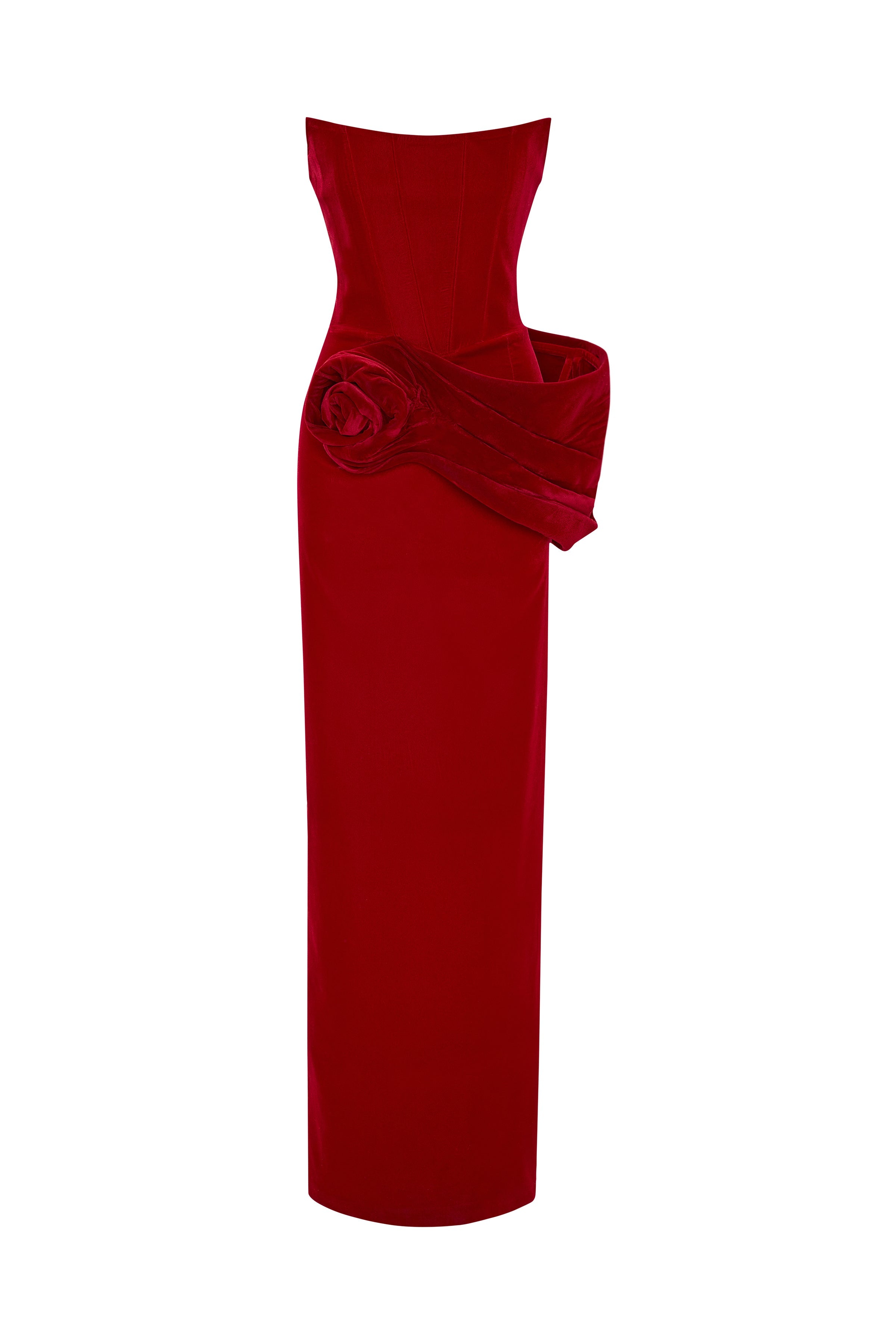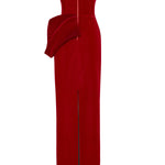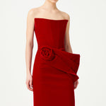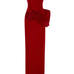 Red Silk Velvet Maxi Dress With Handmade Flower Detail