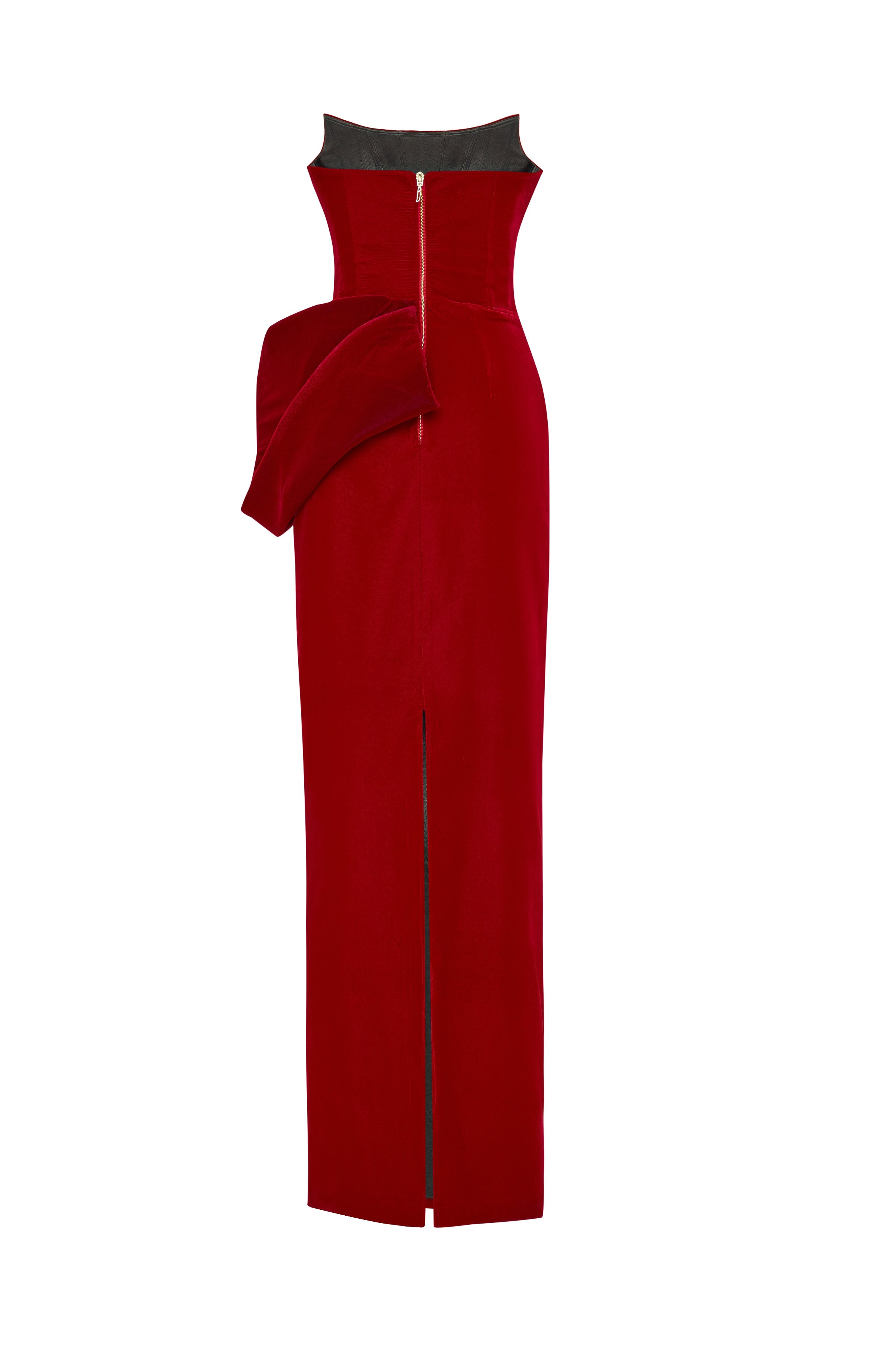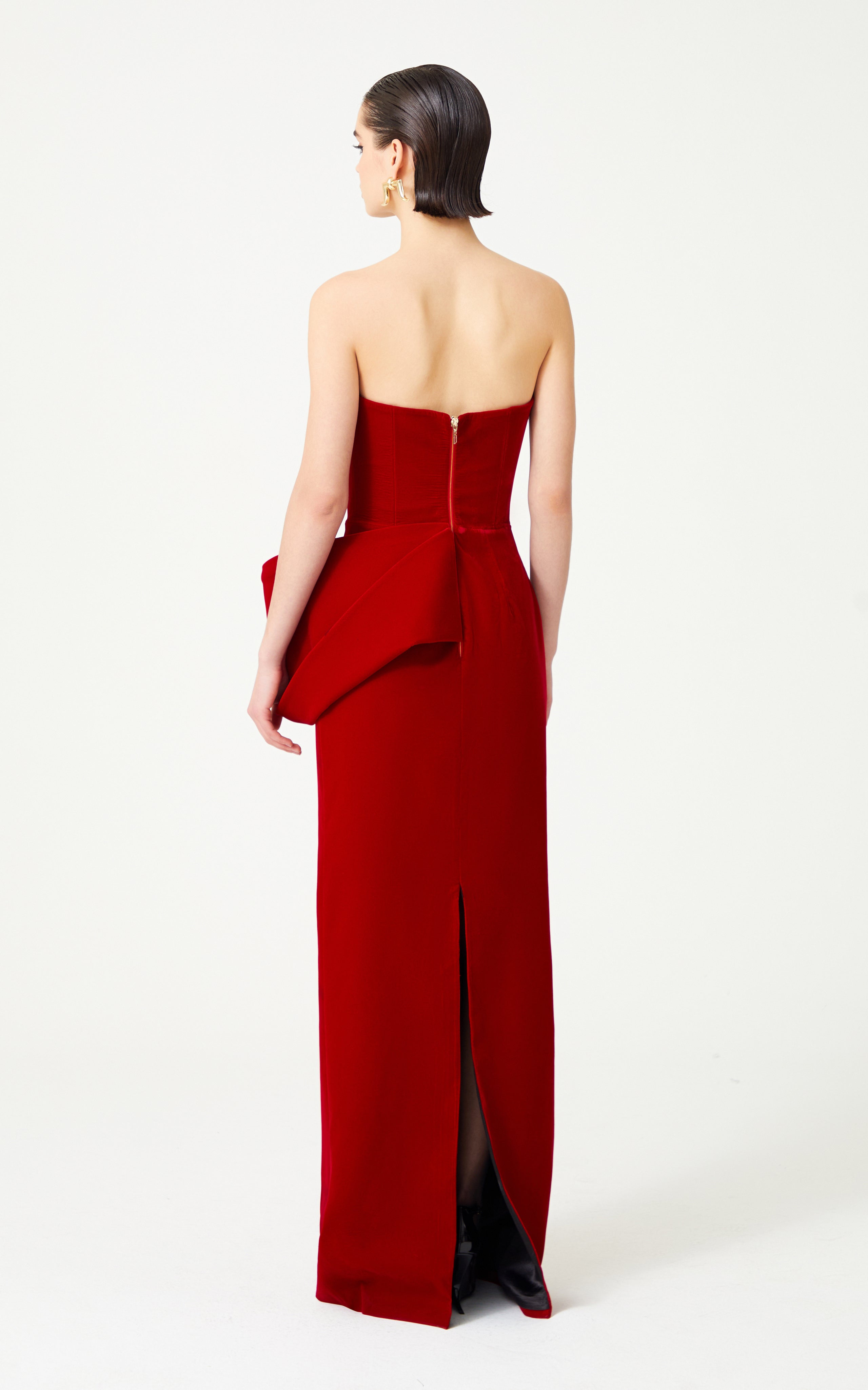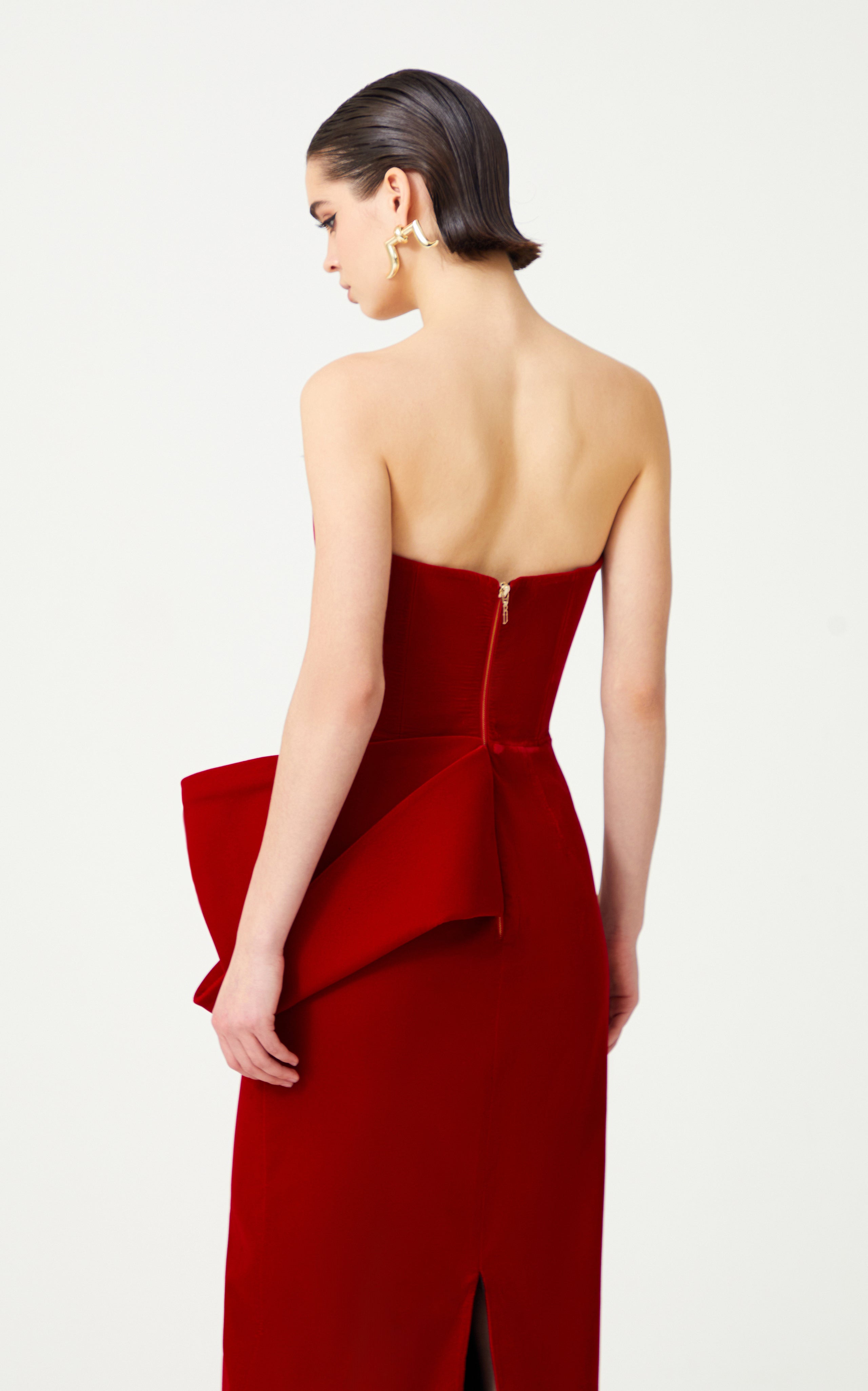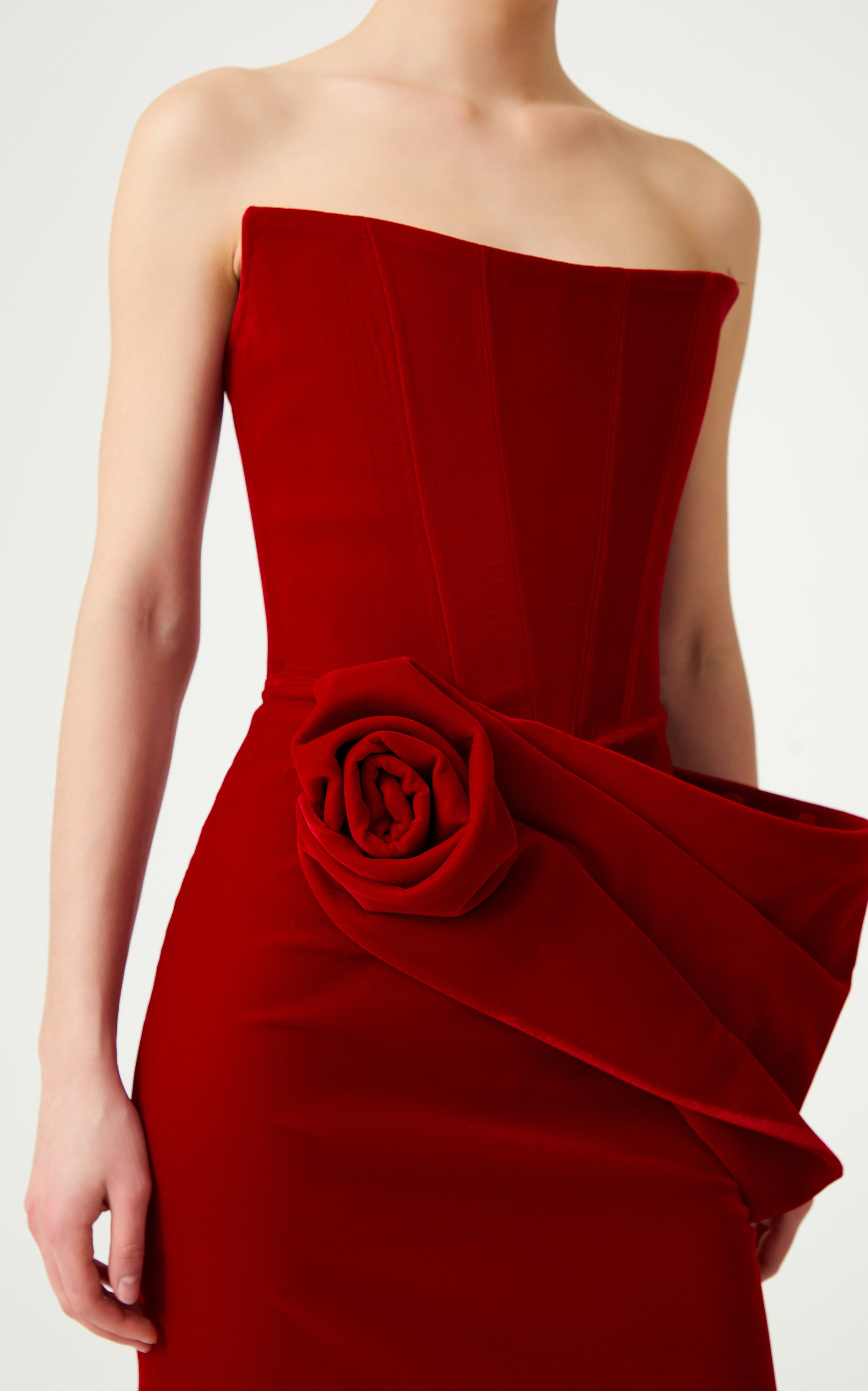 Red Silk Velvet Maxi Dress With Handmade Flower Detail