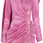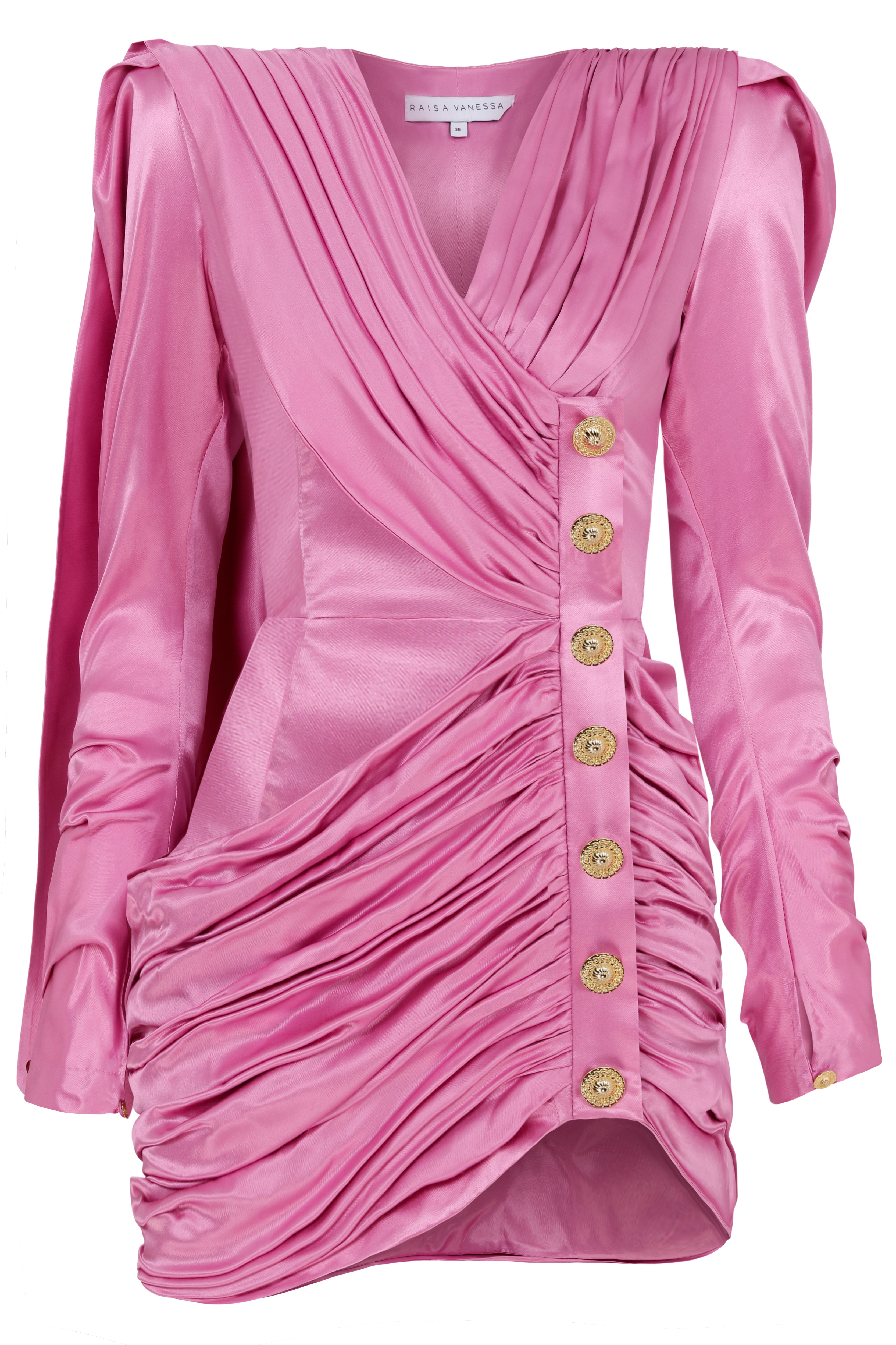 This gorgeous mini dress features draping at the hem and neckline, and has a sash hanging off the shoulder.