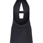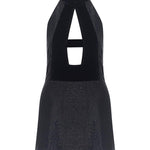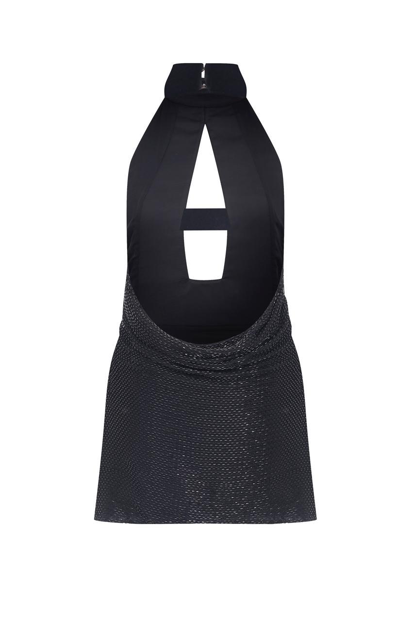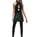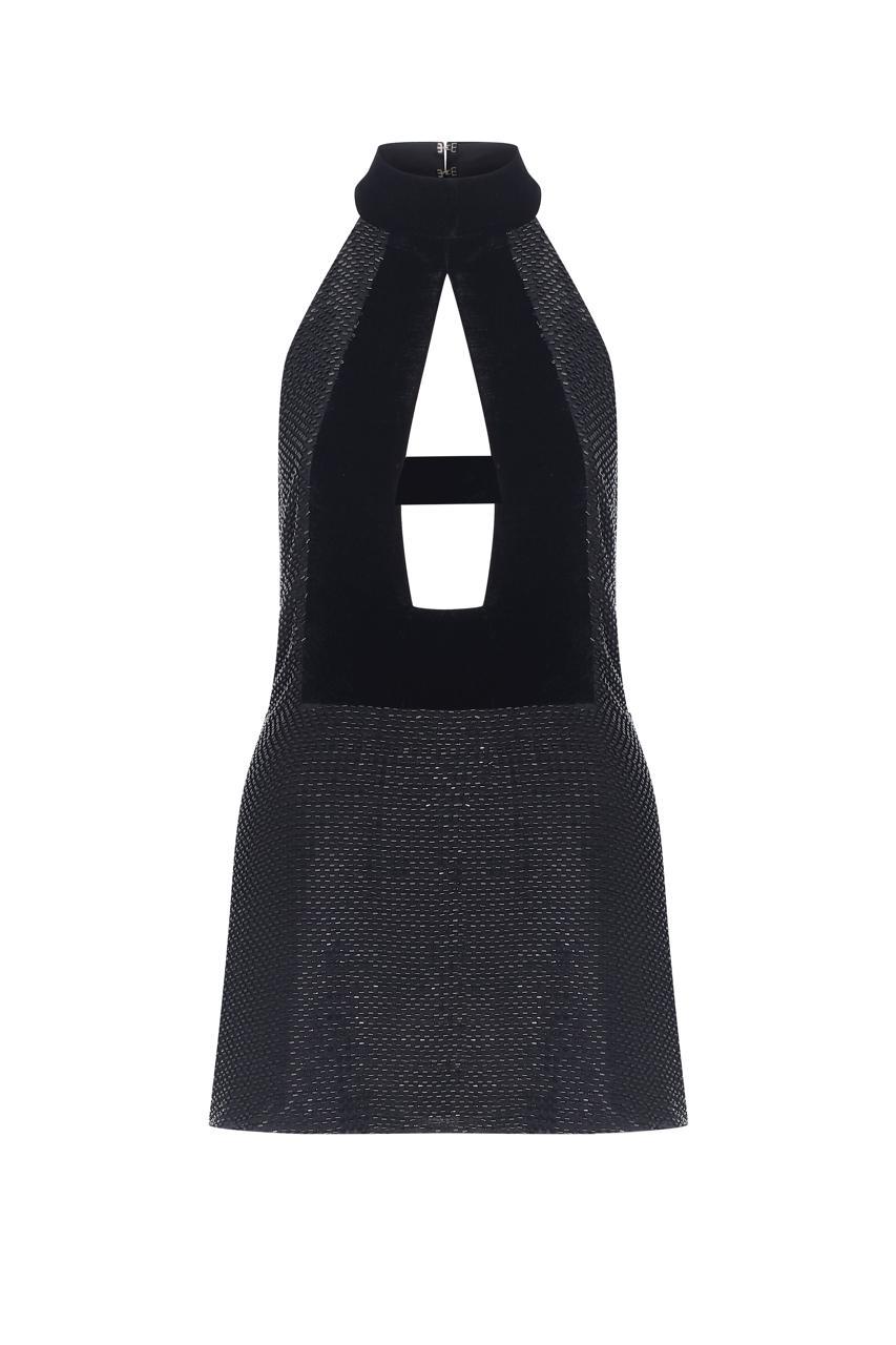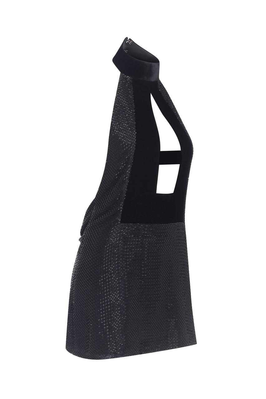 Stone Embroidered Black Mini Dress with Velvet Neck Detail