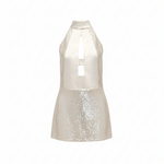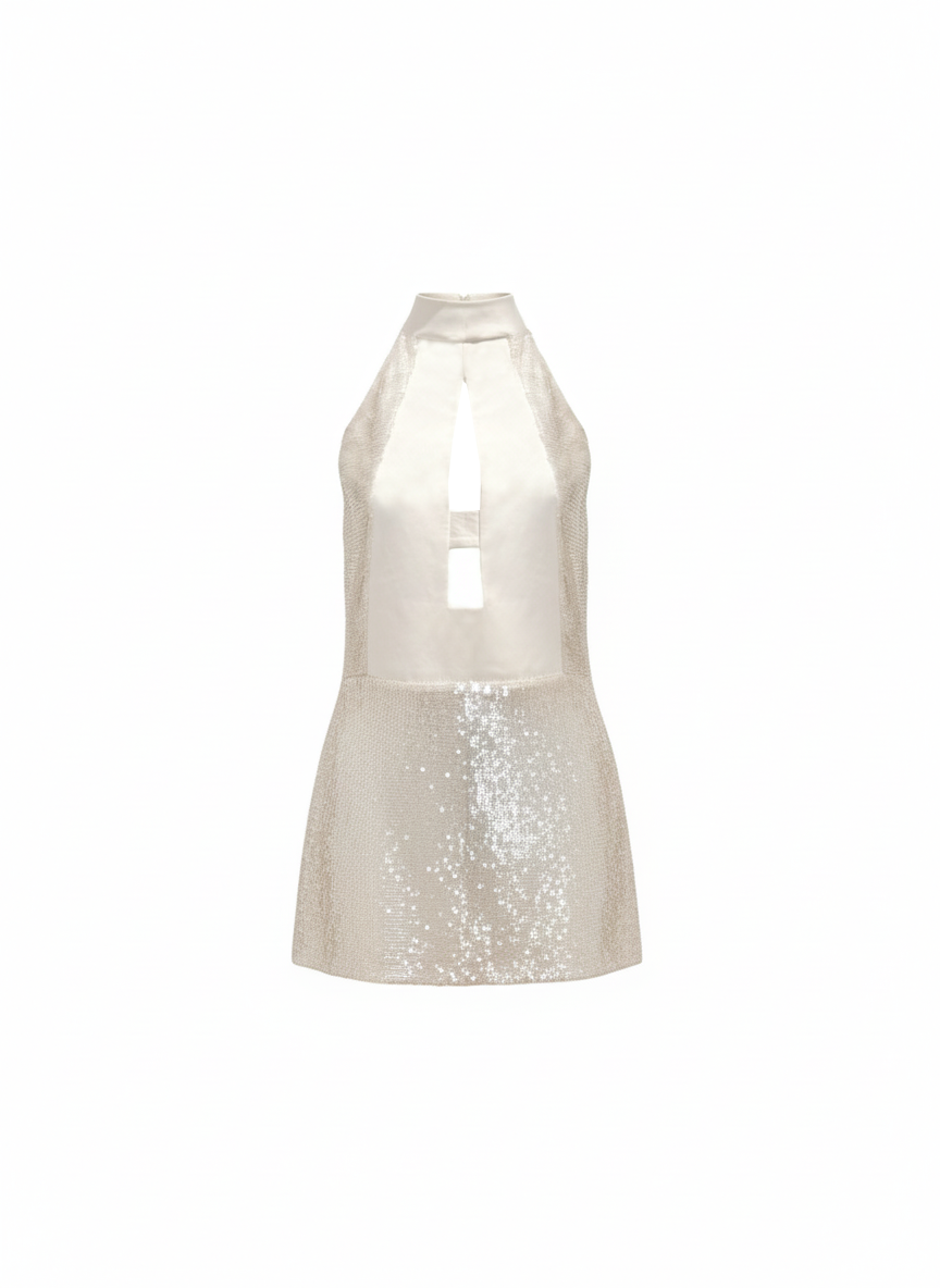 Stone Embroidered White Mini Dress with Velvet Neck Detail