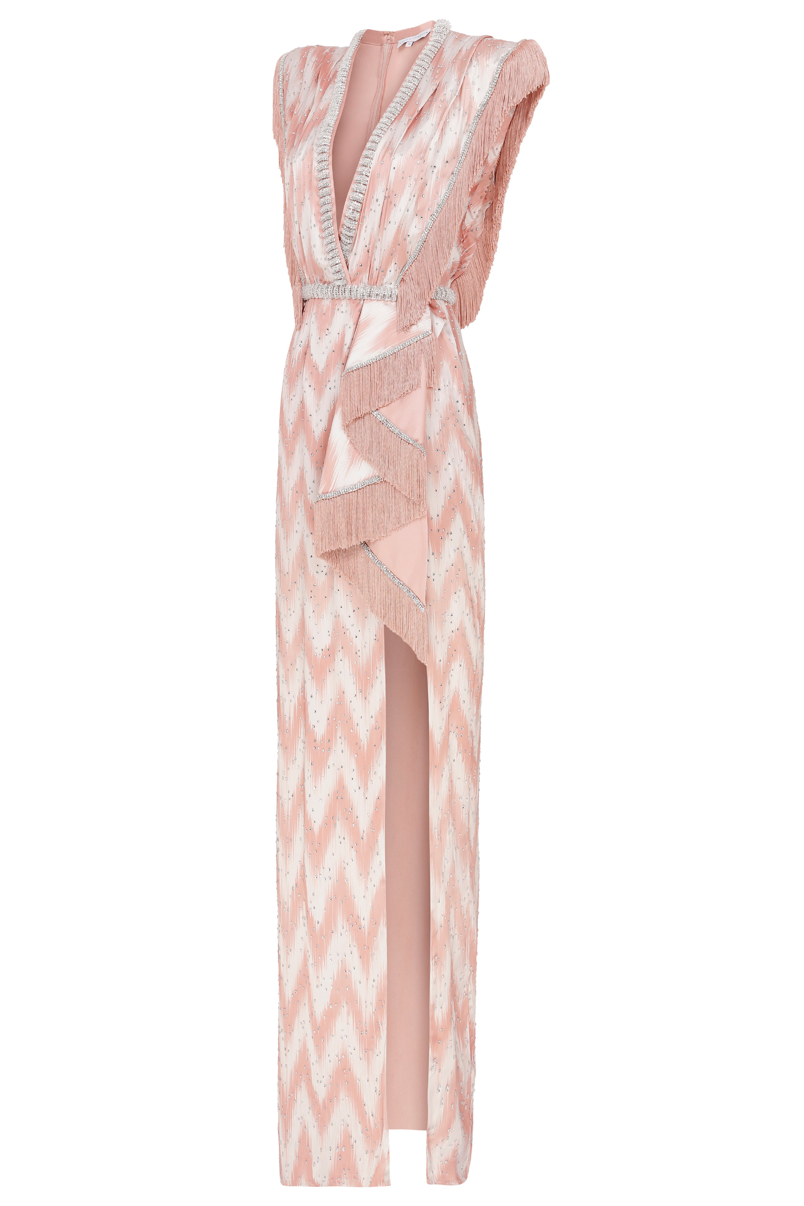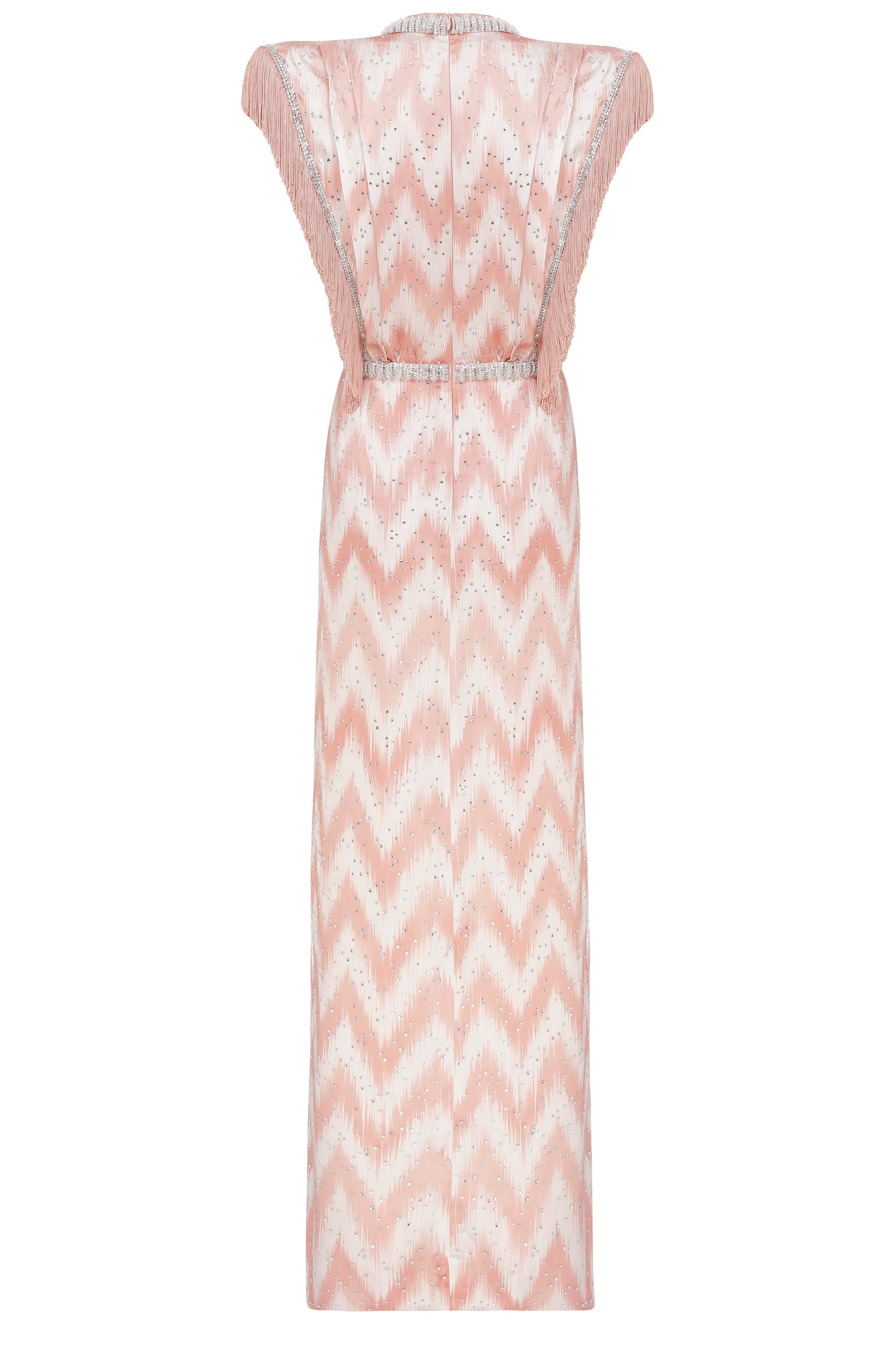 Strass Embellished Zİgzag Patterned V-Neck Maxi Dress with Fringe Detail on Slit