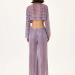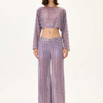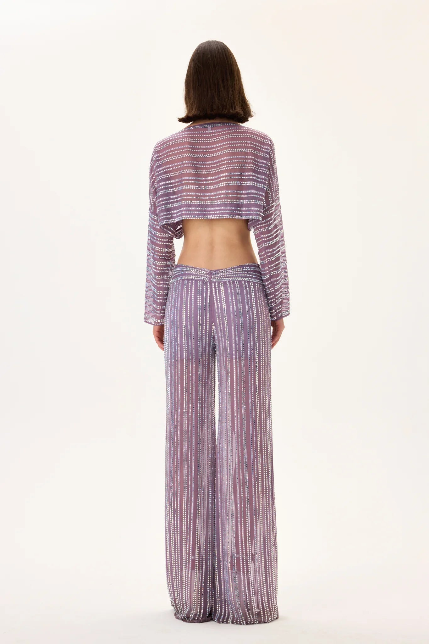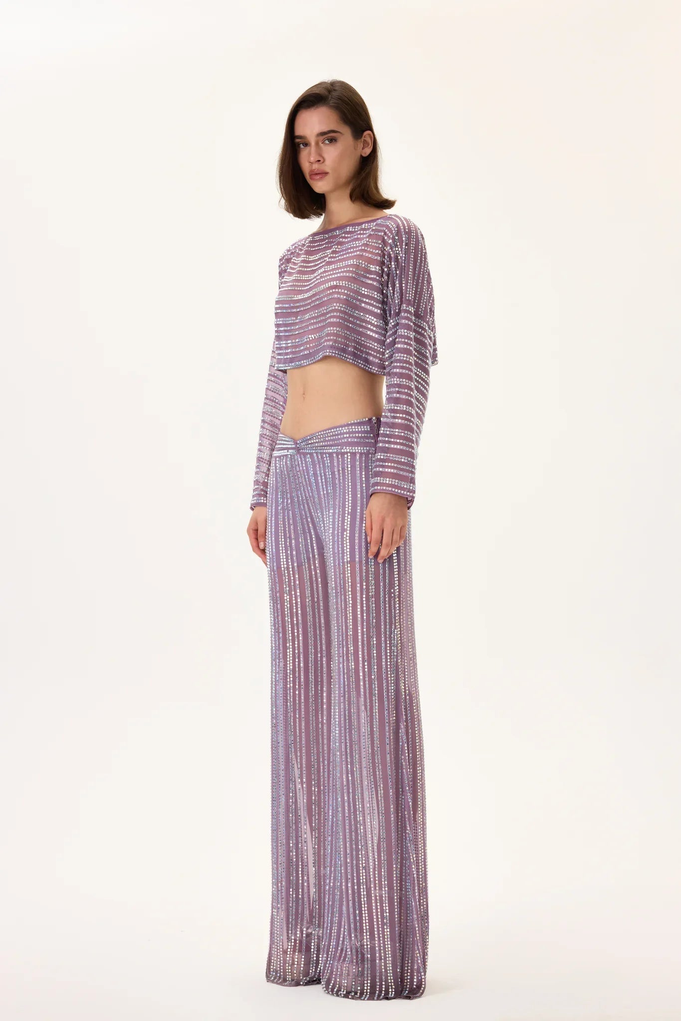 A refined long-sleeved chiffon crop top featuring a delicate violet-inspired crystal print. The lightweight, sheer texture offers fluid movement, while the shimmering crystal pattern adds depth and sophistication. Designed for effortless elegance, this piece combines modern femininity with couture-like detailing, making it ideal for elevated looks and special occasions.