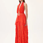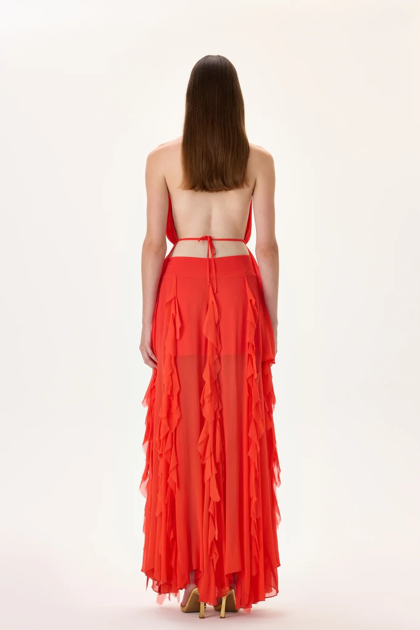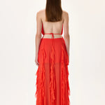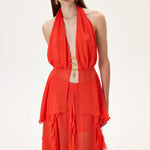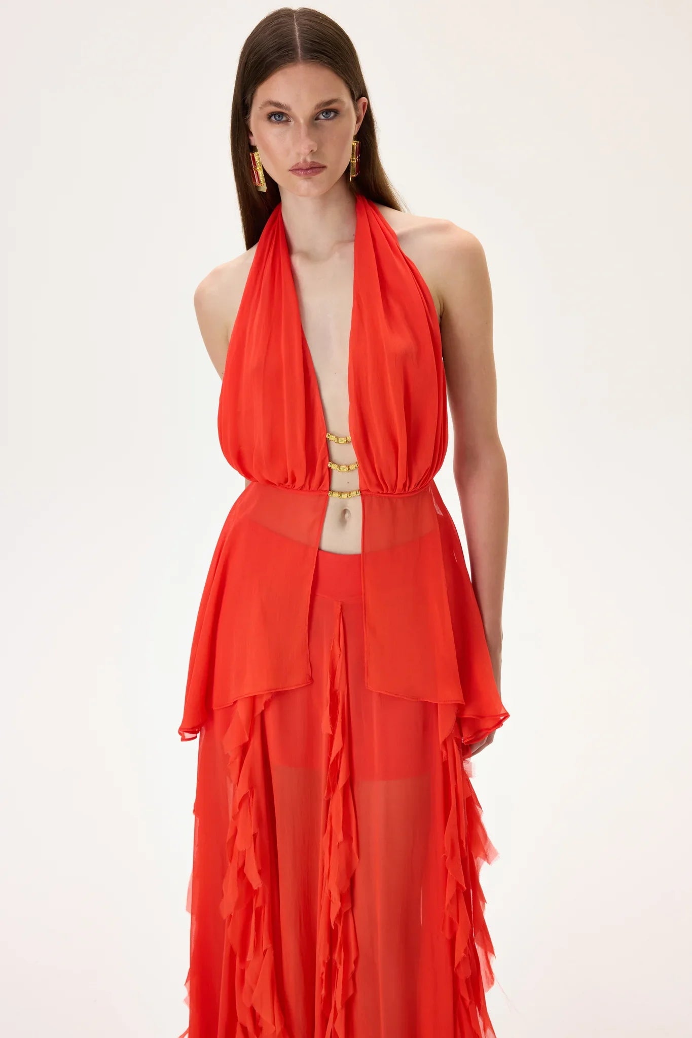 A lightweight, backless chiffon top crafted in vivid pomegranate tones, embellished with exquisite gold metal beadwork. The fluid drape and open-back structure create an elegant yet modern silhouette, offering a refined contrast between delicate movement and couture-inspired detailing.