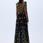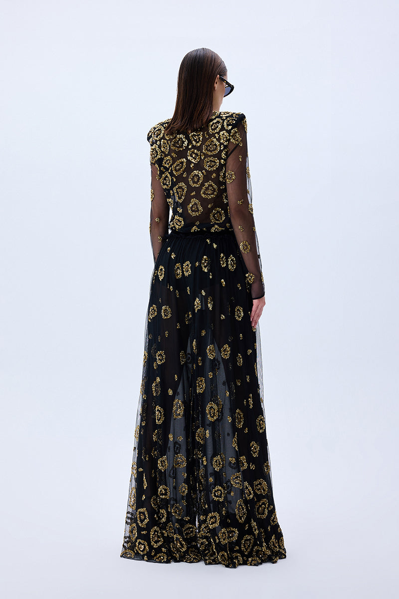 A daring twist on evening elegance. These wide-leg tulle pants shimmer with all-over leopard sequin embroidery, combining fluid movement with high-impact glamour.